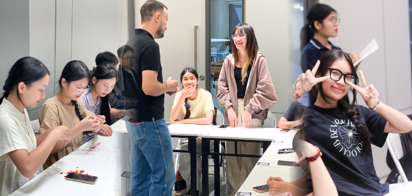 Trong buổi ngày 6/9/2025, người tham gia đã tự tay làm vòng tay và móc khóa handmade – một hoạt động vừa thư giãn, vừa khơi dậy sự sáng tạo. Trong suốt quá trình, giáo viên bản ngữ dẫn dắt bằng cách giới thiệu từ vựng liên quan (chất liệu, màu sắc, cách làm quà tặng, sở thích cá nhân…), đặt câu hỏi mở để mọi người chia sẻ câu chuyện, thảo luận nhóm nhỏ và sửa lỗi phát âm, ngữ pháp ngay tại chỗ một cách nhẹ nhàng.