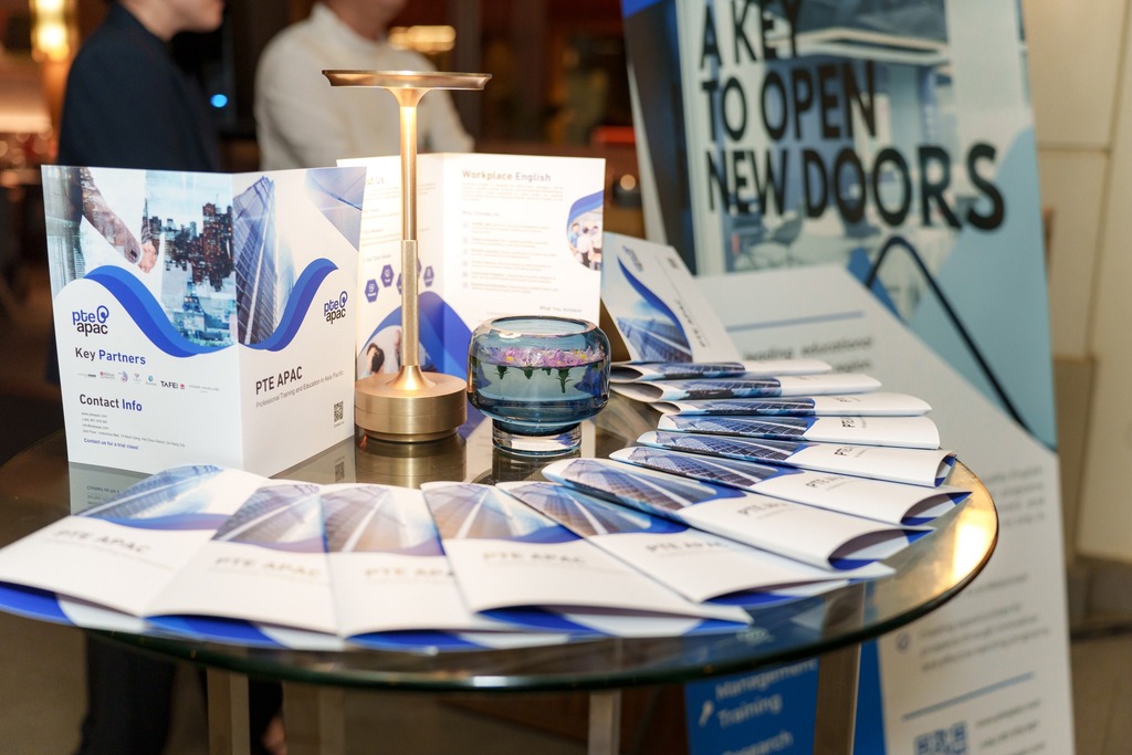 Bàn check-in của PTE APAC Education tại sự kiện, nơi chào đón khách mời và mở đầu cho những kết nối ý nghĩa.